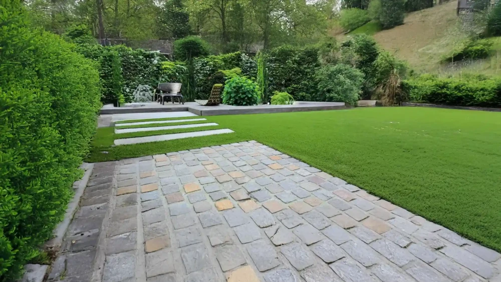 Mise en place soignée d'une pelouse instantanée permettant un résultat immédiat et une homogénéité parfaite.
